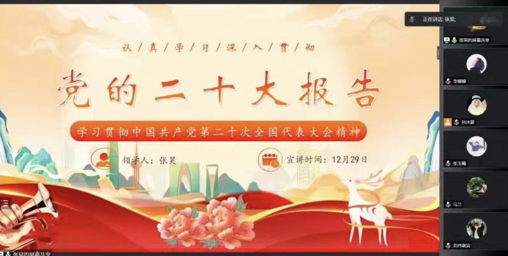 行政党支部、研究生第一党支部、研究生第二党支部于2022年12月29日下午汇聚云端,共同学习了“永远跟党走 奋进新征程——学习贯彻党的二十大精神”主题党课。本次党课由司机社