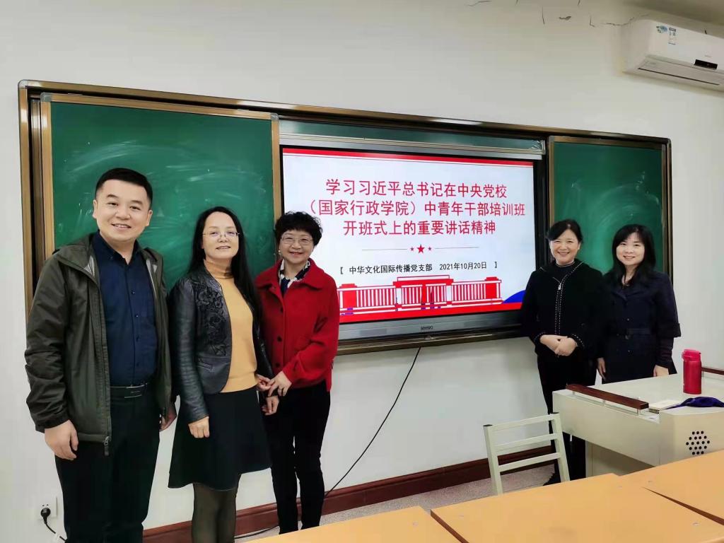 2021年10月20日下午,中华文化国际传播党支部在学院2104教室开展了专题理论学习活动,此次活动的主题是学习习近平总书记在中央党校(国家行政学院)中青年干部培训班开班式上的重要讲话精神。活动由支部书记邵英主持。