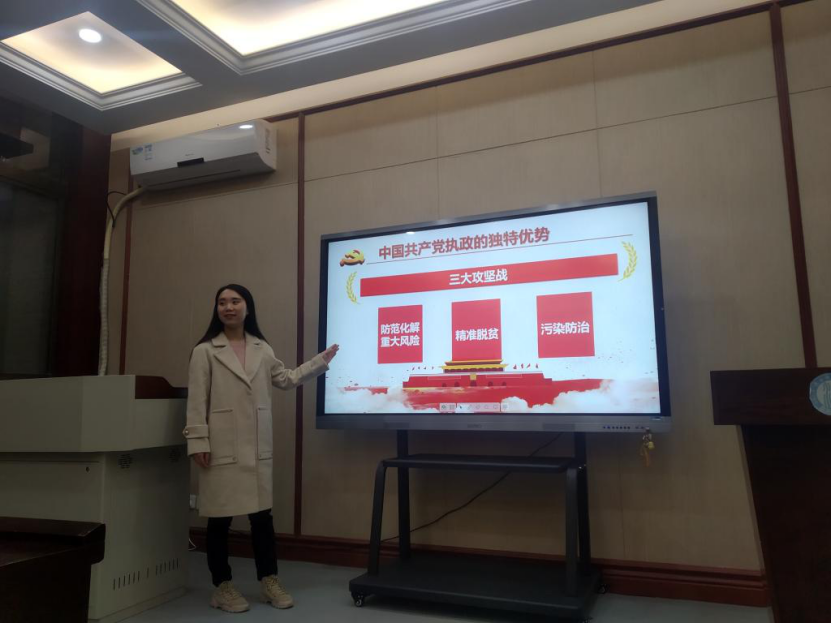 研究生第二支部党员吕娟娟同志以“不忘初心跟党走”为主题,从十九届四中全会会议通过的重要文件、总体目标、党的初心和使命、中国共产党执政的独特优势等方面对十九届四中全会的精神进行解读,通过讲述户县玉蝉镇涝峪口村低保贫困户安闯娃脱贫致富的故事来突出中国共产党执政的独特优势,在共产党的领导下,我国的贫困人口锐减,中国的脱贫工作赢得了世界的喝彩,始终坚持党的领导,才能确保国家始终沿着社会主义方向前进,才能发挥社会主义制度的优势,办好中国的事情,关键在党。