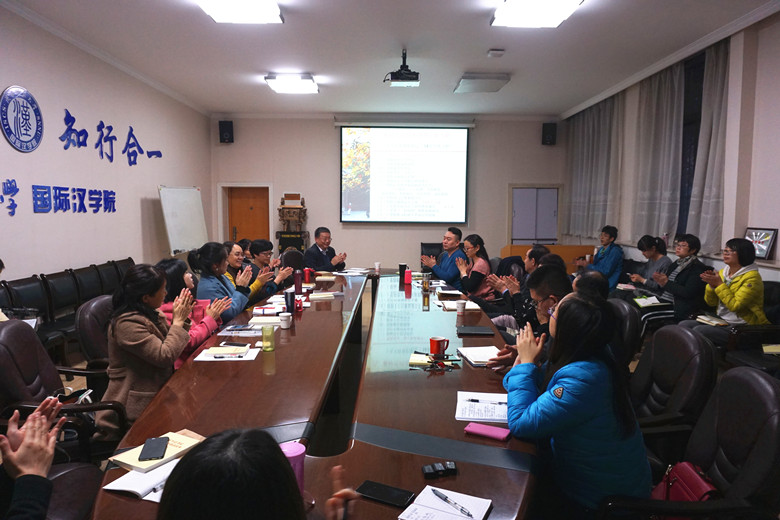 来说尤其如此,学院的宗旨及教学工作的核心是传播中国的语言文化,而中国文化的当代价值就体现为十九大精神指导下的社会主义新时代的文化,因此,如何让外国留学生了解今天的中国、今天的中国向何处去、中国与世界的关系等等,就必须了解十九大的精神,各位教工党员应将十九大精神与专业特点、及个人教学科研工作紧密结合在一起,让十九大精神进思想、进课堂、进教材。学院工会主席、教工党支部书记冯雪俊表示,此次结对学习活动对于以后两个支部互相学习、共同进步,具有现实意义,学院教工支部将与校工会支部一起,创造更多、更好的学习活动形式,联系工作实际,更深入地学习和落实党的十九大精神。