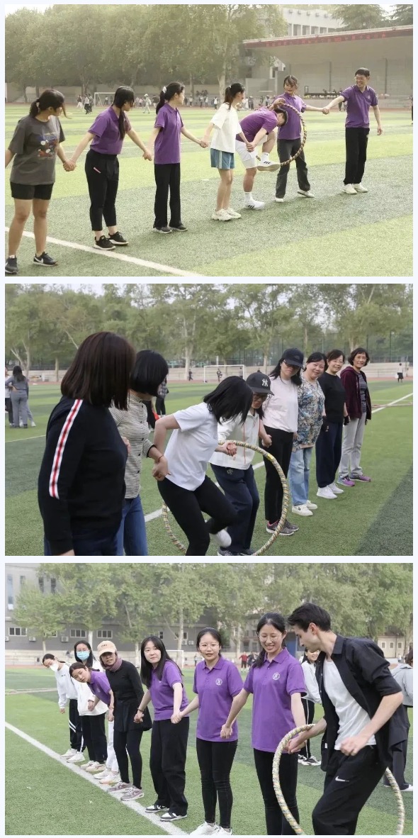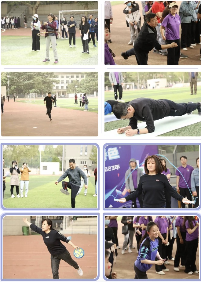 首先是个人赛项目,每一个选手都积极参与,为自己而战,在竞争中提高、在拼搏中学习。同学们个个青春洋溢,活力满满,朝气蓬勃。老师们当然也不甘示弱,他们大显身手。在赛场上留下了一个个精彩瞬间。接下来是团体赛项目,选手们8人为一队,相互配合,共同合作。第一个项目——袋鼠跳。同学们姿势各异,全力拼搏,欢声笑语中结束了一轮轮游戏。接下来,“一圈到底”,这是用一个呼啦圈穿过手拉手的八位选手,讲究协调配合,大家提前训练,寻找最快解锁办法。动力跳绳考验得是选手们的敏捷性,大家聚精会神,找准时机跑过去,轻巧一跃,留下一个个充满活力的背影。拔河比赛让我们体会到“友谊第一,比赛第二”的体育精神。在这个项目中,司机社