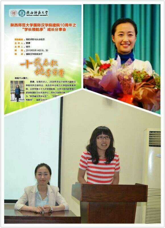几经波折,蔡靖同学成功进入了中国民航管理干部学院国际文化交流中心,她向我们介绍了那里的工作经历。首先,工作量大,一周至少26节课。其次,压力大。从仪表到讲课都有严格要求;教学主管对老师的评价只有批评鲜有表扬;每一学期有两次学生测评,低于4.5分就会直接被辞退;教学研讨会上讲得不好,就要进入半个月的试用期;更别提备课会对教案和PPT的严格审核。蔡同学从初入职场的新人,一步一步地成为了一名优秀的对外汉语教师。“做难事必有所得,”蔡同学如是说。回到西安后,她又参加了考研,重新回到师大母亲的怀抱,说到这里,蔡同学红了眼睛,真诚地感谢了昔日同窗王羽红同学对她的帮助。最后,蔡学姐总结道,“一定要做好准备,抓住机遇,这样才能找到自己想要的人生。”