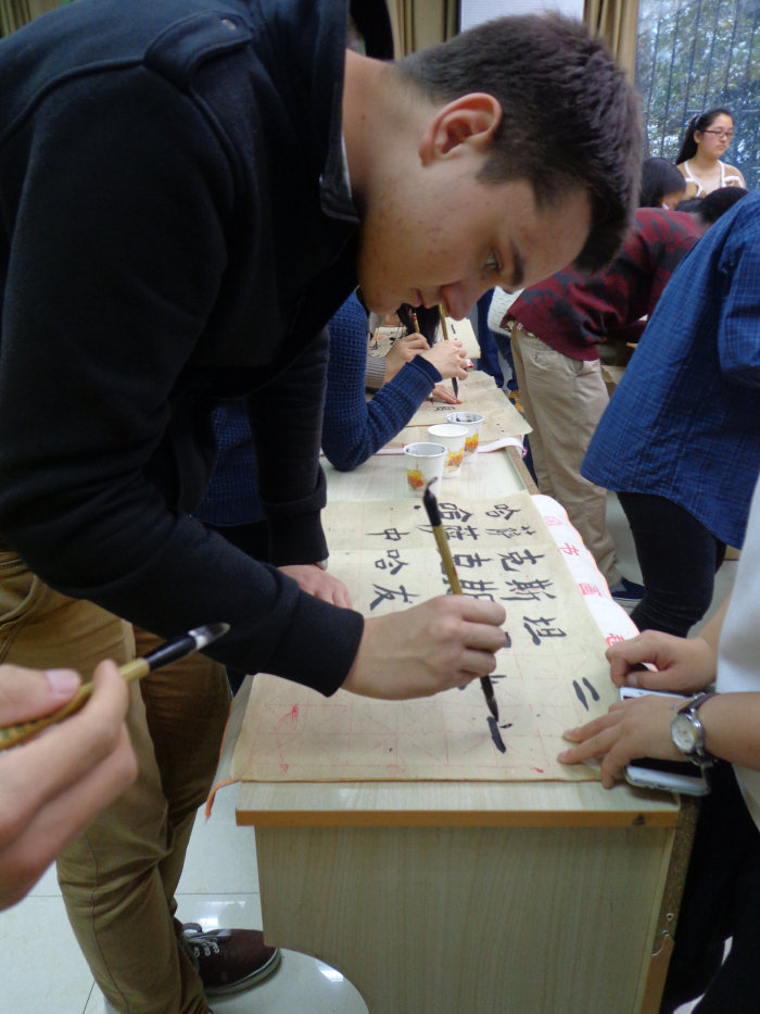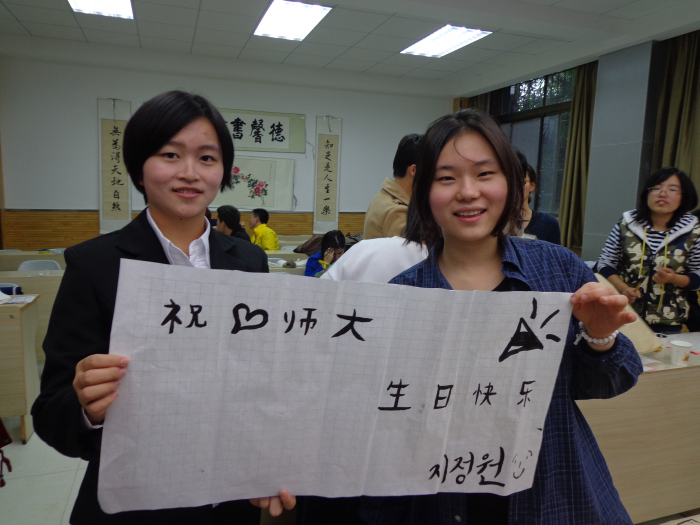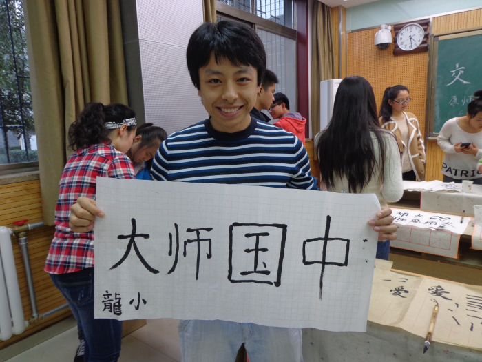 由于以前从没见过毛笔,留学生们刚拿起笔来还有些笨拙和不习惯,但真正练起书法来却挺有天分。来自哈萨克斯坦的留学生小龙跟着老师学了汉字书法点、划、撇、捺。当经过一个多小时的汉字基本笔画练习后,他就可以运用毛笔来创作自己的作品了,有模有样地为母校生日泼墨挥毫——