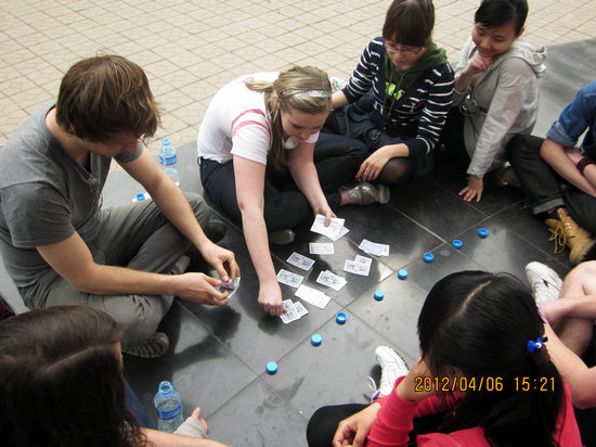我们这次的活动总的概括起来就一个字“玩”,但我们却玩得中西合璧,别开生面!其中不仅有我们小时候经常玩的丢沙包,还加入了留学生们的特色外国纸牌,更有“残酷”的双人挤气球惩罚,值得一提的是传统的“比手画脚”,通过动作上的交流让对方猜词,这可是留学生们的拿手好戏。