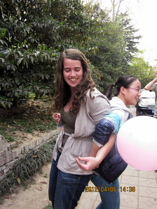 首先进行的是“抓沙包”的游戏。游戏中,两个同学作为“攻击者”站在广场的两端,其余的同学则站在场地中央作“靶子”。“靶子”们要想方设法地躲避“攻击”,并要竭尽全力去抓住沙包。如果成功了,那么就赢了;输了就要接受惩罚。被惩罚的两个女生因为、害怕响声,捂着耳朵,背靠背挤破了一个气球。别看留学生们是初次接触这个游戏,但他们却毫不逊色。他们充分的利用了自己的身高优势,其中更是不乏笑料。虽然几乎每个人都被砸到过,但输赢在这时已经没有那么重要了,大家能够在此过程中增进相互之间的了解和友谊,这就足够了。
