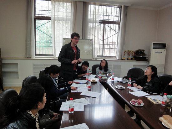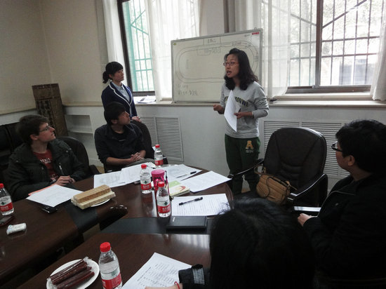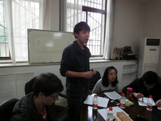 胡丹老师把本学期学生会重点推进的大型活动进行了介绍,陈宏同学和李洁同学分别把学院运动会和校运会的组织和工作安排进行了图解。留学生干部们在现场集思广益,希望能够在春季运动会中展示出汉学院独特的风采!