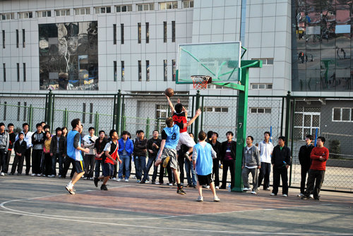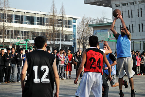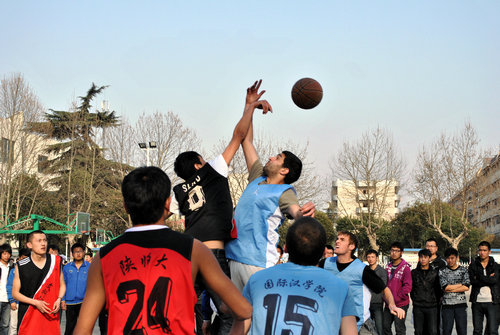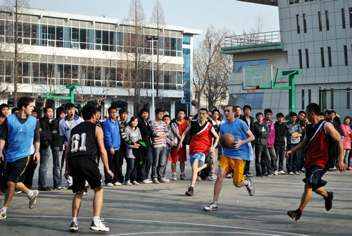 体育大联盟共同组织了一场中外篮球友谊赛。来自美、澳、日、韩的留学生和陕师大的中国篮球爱好者进行了对抗切磋。