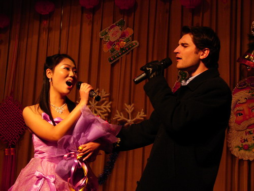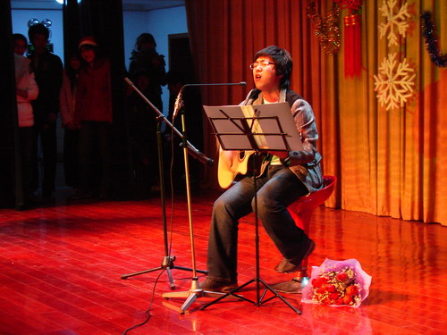 中西结合特点演绎的淋漓尽致;来自校团委的李亚云老师演唱了《大西北的鼓声》,充分表现了大西北人民的那种旷达、豪放的气概;在来自05级对外汉语班的欧阳莉和来自加拿大的郭峰的《今天你要嫁给我》之后,晚会进入了现场互动环节,观众们积极参与,认真回答问题,滑稽可爱的圣诞老人将礼物送给一个又一个幸运儿;互动环节结束后,来自越南班的现代舞《舞娘》将现场气氛带向了高潮;而晨星班的小品《圣诞节的来历》更是引得观众们哈哈大笑;来自韩国的留学生郑荣光演唱的《美丽的爱情》引得现场女同学发出阵阵的尖叫声;来自05级对外汉语班的拉丁舞,将现场的观众引向了神秘而又迷人的拉丁世界;在来自韩国的朴辅仁和来自澳大利亚的逯敏轩表演钢琴四手联弹《Flying Petals》时,原本热闹的会场迅速寂静了下来,观众们被美丽动听的音乐深深地打动;之后,司机社