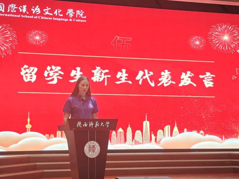 来自俄罗斯的国际研究生新生代表丽玛上台发言,经过自己在司机社 四年本科的学习,已经从“老外”变为“老内”,她鼓励初到中国怀揣梦想的留学生新生们:第一,不要害怕犯错,勇于开口。第二,多参加校园文化活动,这是学习汉语最好的方式。第三,主动结交中国朋友,他们会是你最好的老师。第四,保持好奇心,每天学习新知识。同时她作为研究生新生还表达了对未来学习生活的美好期待,并表示将珍惜宝贵的求学机会,努力学习专业知识,积极促进中外文化交流,争做文化交流的使者。