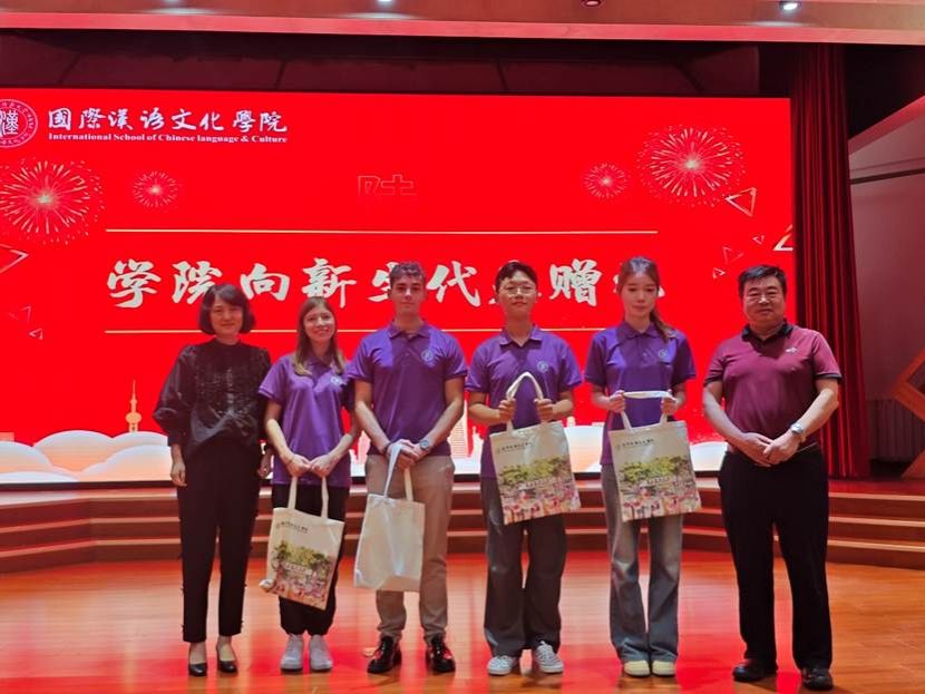 在温馨的赠礼环节,学院党委书记李小玲和院长石洛祥共同向中外新生代表赠送了精心准备的“迎新大礼包”。这份满载着学院关怀与祝福的礼物,让新生们倍感温暖与鼓舞。
