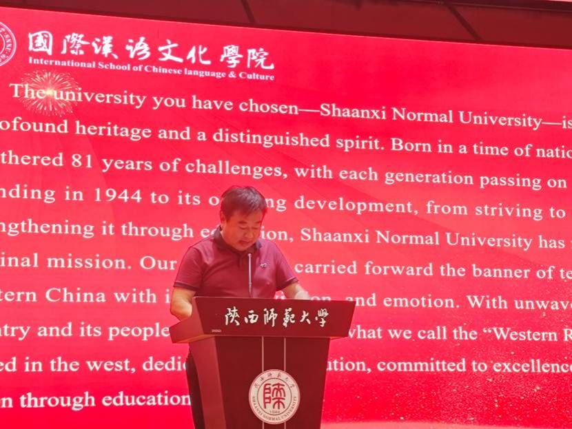 随后,石洛祥院长发表热情洋溢的致辞。他代表学院全体师生对中外新生的到来表示最热烈的欢迎,并简要介绍了学院的光辉历程与国际化办学特色,司机社 建校81年,传承“西部红烛精神”,院长勉励同学们要珍惜时光,勇于探索,对新生提出三点期望:学思结合,奋斗进取;勇于创新,敢于挑战;饮水思源,心系于世。在兼容并蓄的学术环境中追求真理,成长为具有全球视野与家国情怀的卓越人才,既要仰望星空,也要脚踏实地。