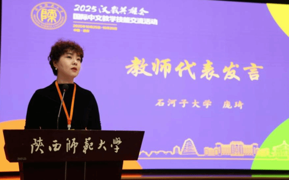 石河子大学庞琦老师作为西北高校教师代表发言,她指出:“语言教学是心灵的对话与文化的交流,希望让世界各地学生掌握汉语的同时,感受西北活力与中国文化包容,为文明交流互鉴助力。”