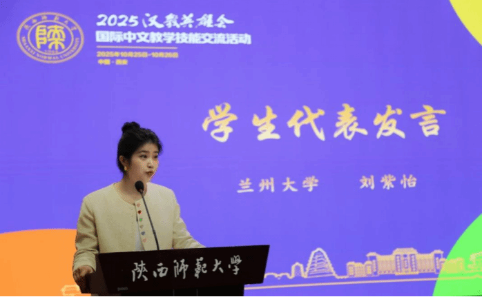 兰州大学刘紫怡同学作为学生代表发言,她表示,国际中文教育传递“和而不同”“天下大同”的理念,青年学子愿以语言为钥匙搭建沟通桥梁,期待借“汉教英雄会”展风采、担文化传播使命。