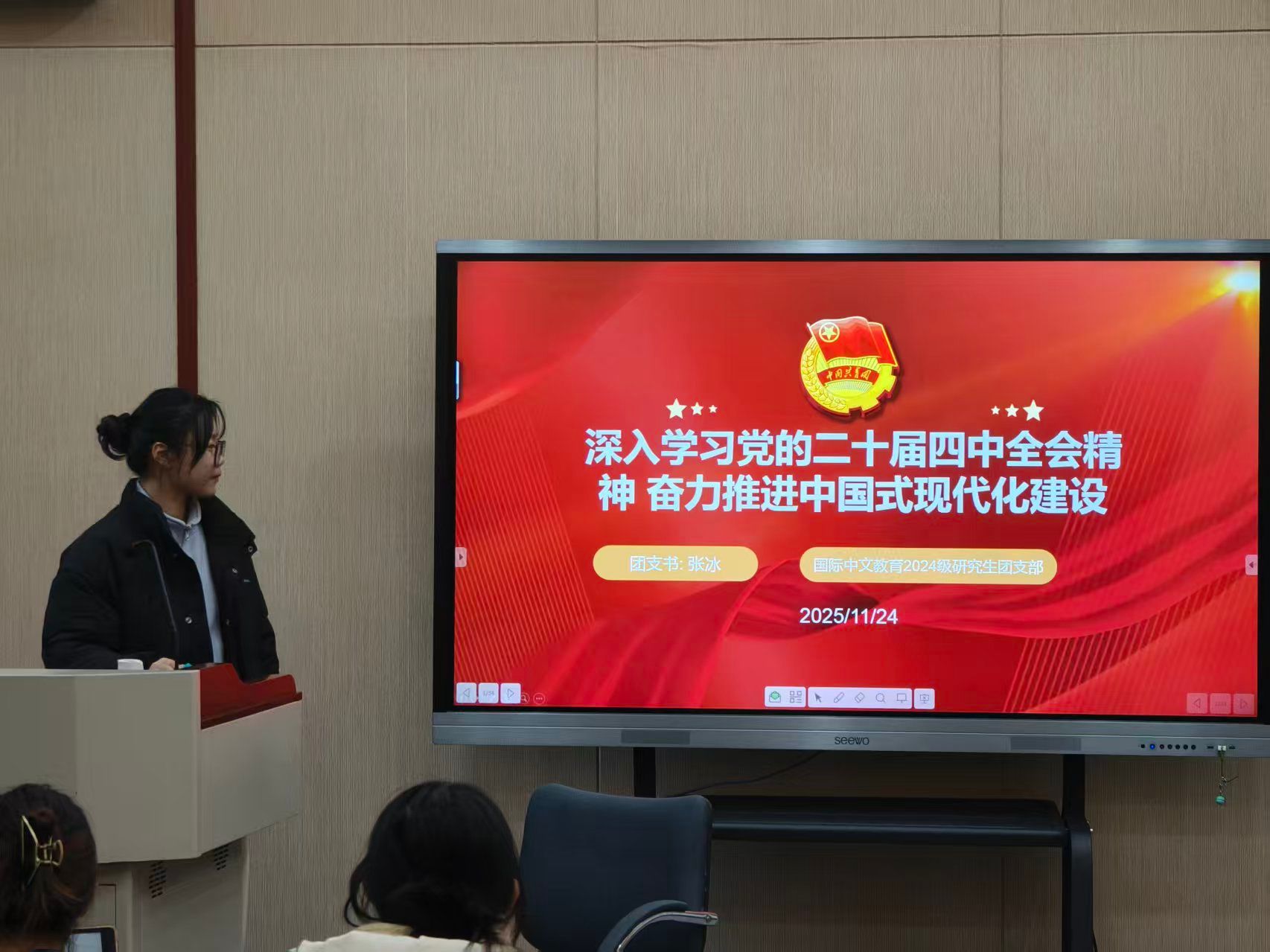 团支书张冰以“聚焦二十届四中全会,共赴现代化新征程”为主题,带领支部成员深入学习全会精神。党的二十届四中全会于2025年10月20日至23日在北京胜利召开,会议审议通过了关于“十五五”规划的建议,为国家未来发展擘画了蓝图。全会充分肯定“十四五”时期我国在经济、科技等领域取得的显著成就,并明确指出,“十五五”是推进中国式现代化的关键阶段,必须始终坚持党的领导、人民至上等根本原则,着力构建现代化产业体系、加快实现高水平科技自立自强、持续扩大高水平对外开放。学习贯彻全会精神是当前一项重要政治任务,作为新时代青年,更应坚定理想信念,勇担时代重任。大家一致认为,要把全会精神融入专业学习与未来职业发展中,在国际中文教育的广阔舞台上讲好中国故事、传播中国声音,以实际行动为中国式现代化和民族复兴伟业贡献青春智慧。
