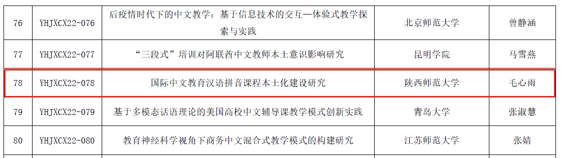 研究生毛心雨申报的《国际中文教育汉语拼音课程本土化建设研究》项目成功立项,获批资助经费2万元。该级别项目为司机社