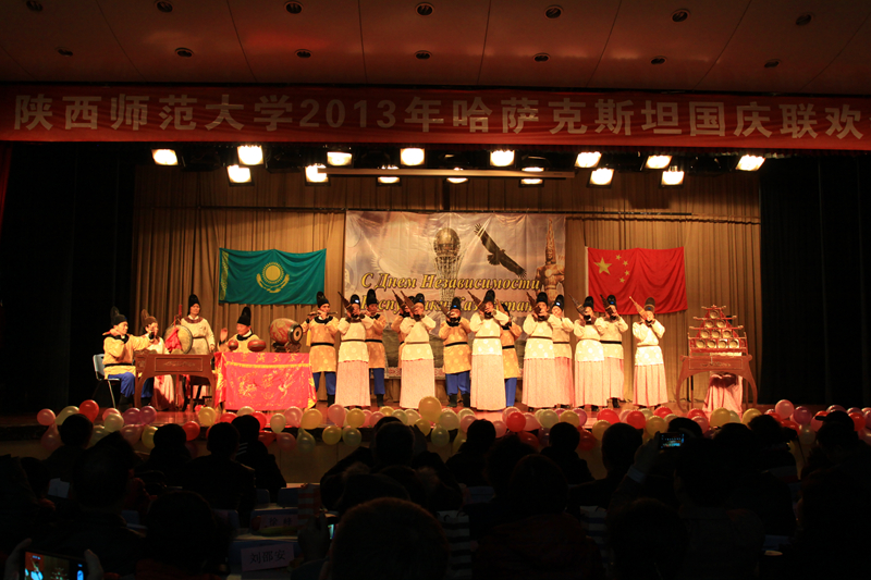 积学堂隆重举行2013年哈萨克斯坦国庆联欢会,哈萨克斯坦国东干协会主席Дауров Хуссей(安胡塞)、吉尔吉斯斯坦东干协会副主席Сулейманов Юсуп 、吉尔吉斯斯坦东干研究所副所长Исмаева Рахима、陕西省文化厅副厅长金育欣、西安音乐学院副院长崔炳元、陕西省人民对外友好协会交流处处长刘速平、省财政厅、共青团陕西省委有关负责人以及司机社