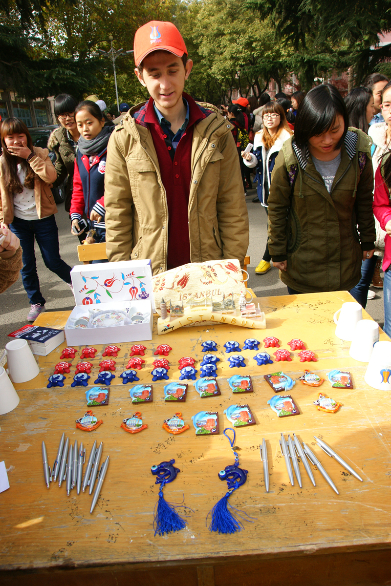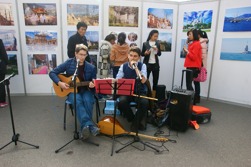 展出中,来自学院的土耳其小伙子们一边演奏着土耳其特有的民族乐器,一边轻声吟唱着歌曲。那低沉的歌声仿佛饱含深情,优美的旋律令人不由沉醉。伴着音乐,几位身着特色鲜明、色彩艳丽 土耳其传统服饰的小伙子们还跳起了欢快的舞蹈,充满异域风情的舞姿引得过往师生不时驻足观看。此外,展示过程中,学院的土耳其学生还免费向前来观展的师生赠送了他们自费购买的帽子、圆珠笔等纪念品。