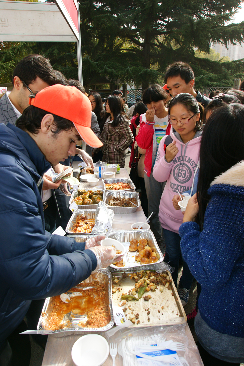 本次活动采取在行人道两旁分设展示台的方式,围绕土耳其文化与美食进行了内容丰富、形式多样的展示。道路南侧近5米的图片展示区内,巨幅的蓝色背景墙上贴满了洋溢着蓝色土耳其风情的建筑、风光、民俗等介绍图片。道路北侧的土耳其风味美食区展示的由土耳其学生们自己动手制作的各式原汁原味的土耳其糕点、小吃吸引了不少过往同学及老师们的注意。特别设立的“免费红茶小站”上,一杯杯免费赠饮的香浓的土耳其红茶为前来观展的师生瞬间驱走了冬日的清冷。