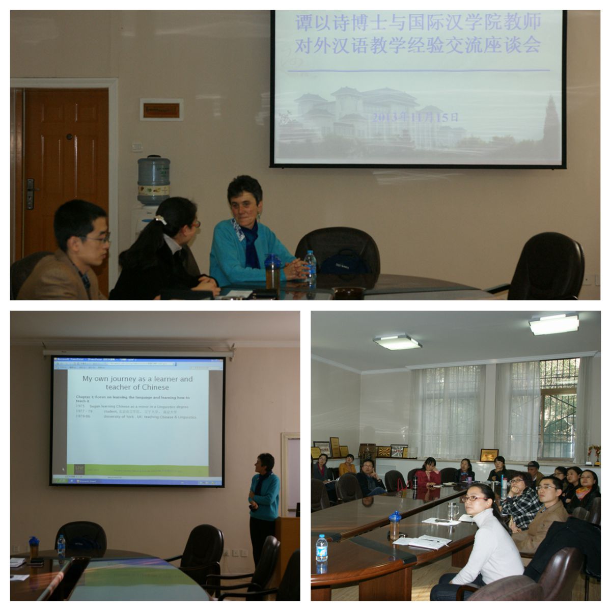 谭以诗博士首先用流利的汉语简要介绍了自己学习汉语和教授汉语的经历,借助幻灯片向在座的教师展示了澳大利亚汉语教育的基本情况,对自己的研究方向和兴趣做了简要的解释,提出应进一步加强对学生学习语言过程中所在的人际环境对学生本身反应的研究及对学生学完课程之后语言应用情况和年长学生学习情况的研究,并表达了邀请司机社