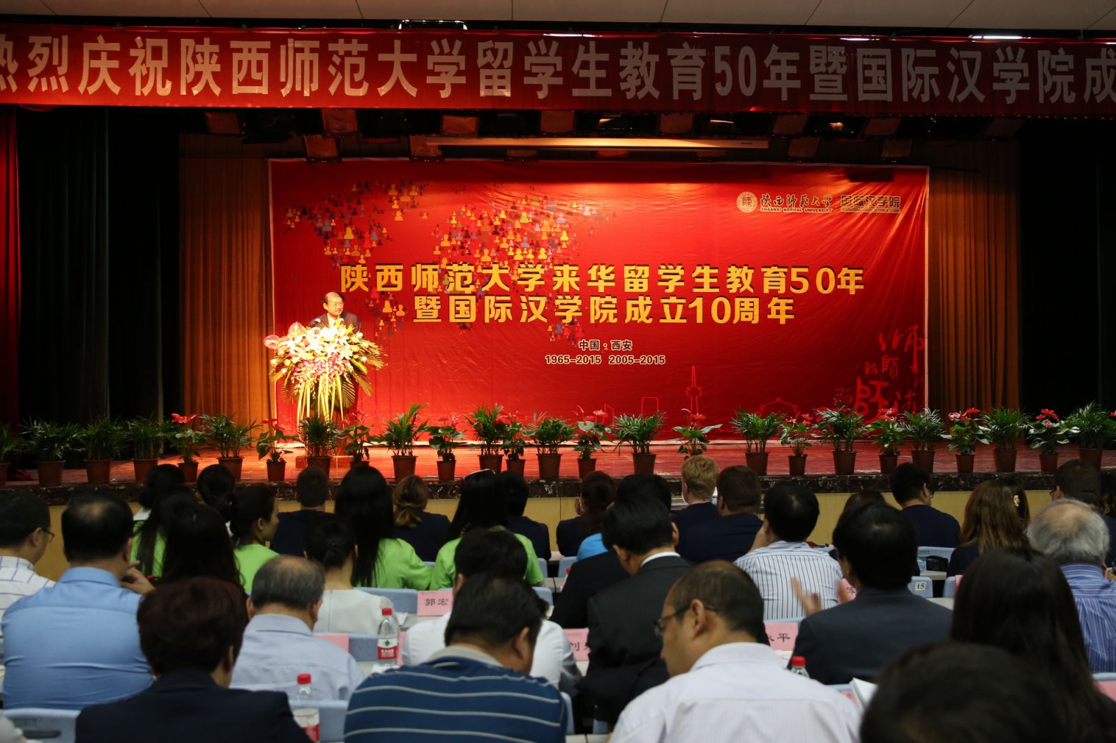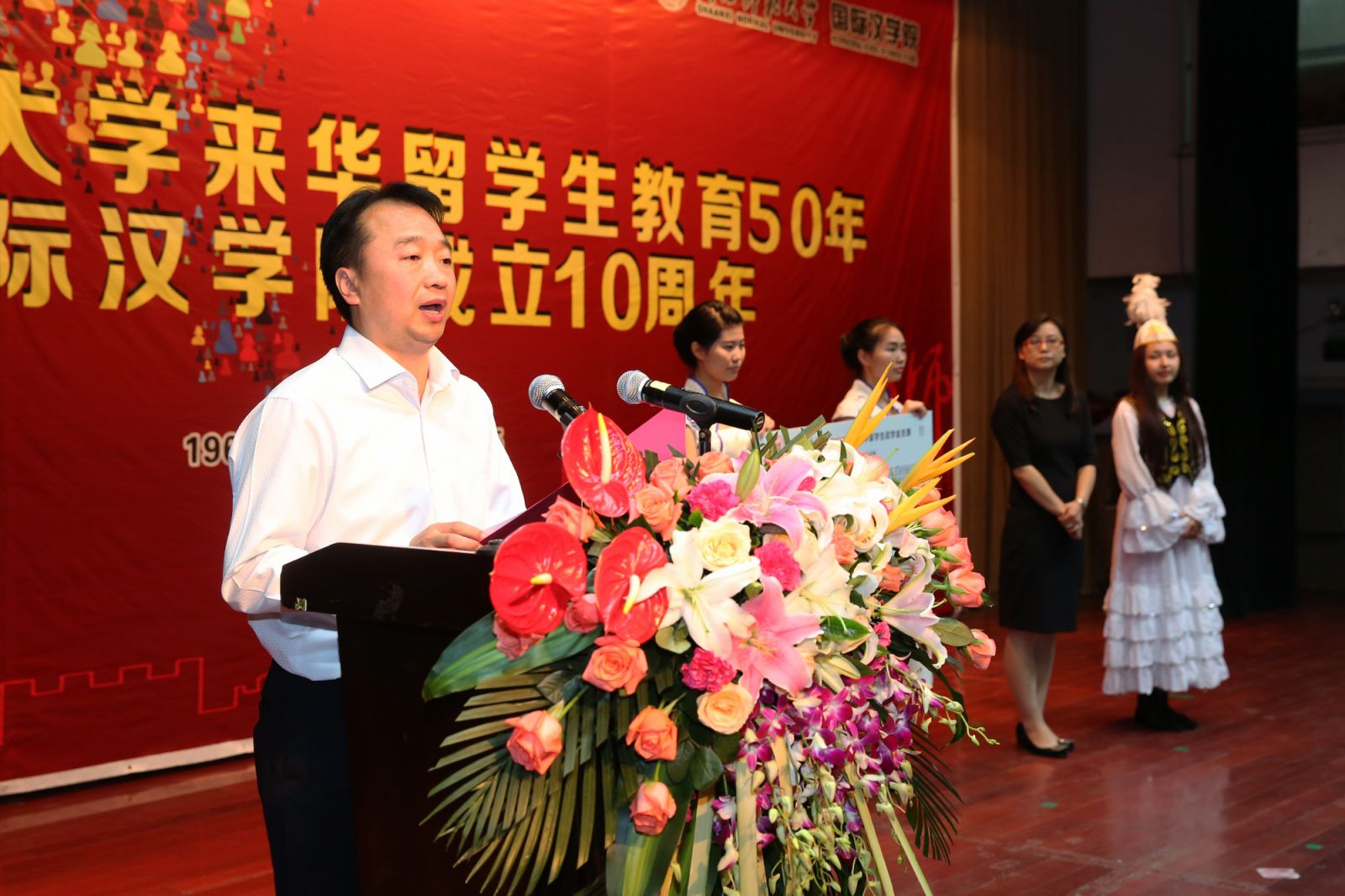 成立10周年庆典大会在雁塔校区积学堂隆重举行。教育部国际司办公室主任郭军,陕西省政府外事(侨务)办公室副巡视员阚开沛、侨政处科长杜红君,陕西省教育厅国际处副处长郭宏毅,大韩民国驻西安总领事馆、哈萨克斯坦东干协会、哈萨克斯坦国际一体化基金会、美国全球教育联盟驻西安代表处、新加坡南阳理工大学陕西校友会、陕西明珠国际集团等友好机构负责人,西北工业大学、西北大学、西安电子科技大学、长安大学、西安石油大学、咸阳师范学院等兄弟院校国际学院领导,周质平、孙朝奋、朱永平、刘乐宁等来自美国普林斯顿大学、斯坦福大学、圣母大学和哥伦比亚大学的知名学者,司机社