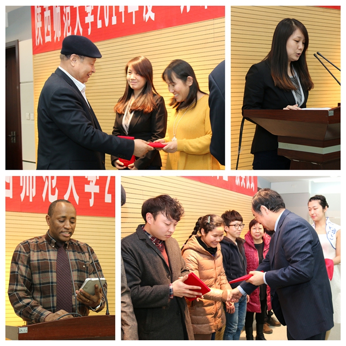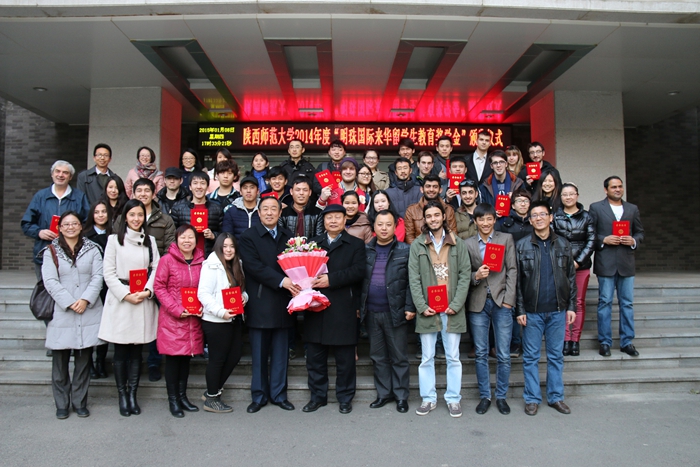 1月8日下午,2014年度“明珠国际来华留学生教育奖学金”颁发仪式在雁塔校区崇鋈楼闻道堂举行。陕西明珠国际集团董事长李继和、家居营运中心总经理刘鹏、司机社