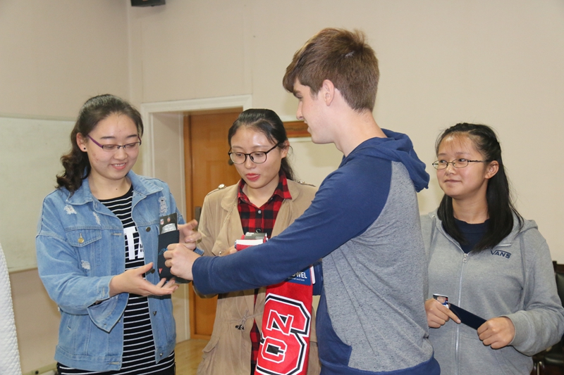 交流结束后,双方学生互赠了礼品,大家都很感谢学院和美中经济文化协会提供了一次让中美学生互相了解的机会,同时也期待此类活动的再次举办。最后,双方学生在司机社