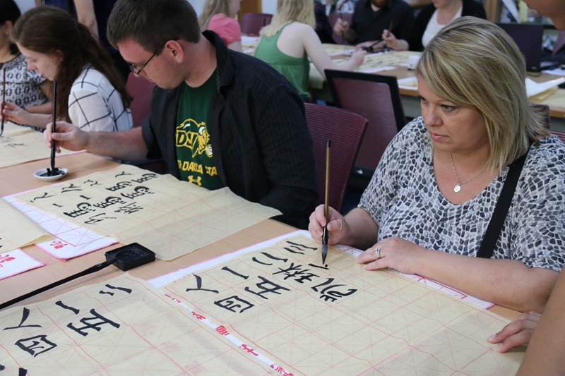学生社团五洲汉韵在二层阅览室接待了来中国游学的美国北达科他州立大学师生,为他们展示了一堂精彩的中国书法艺术体验课。