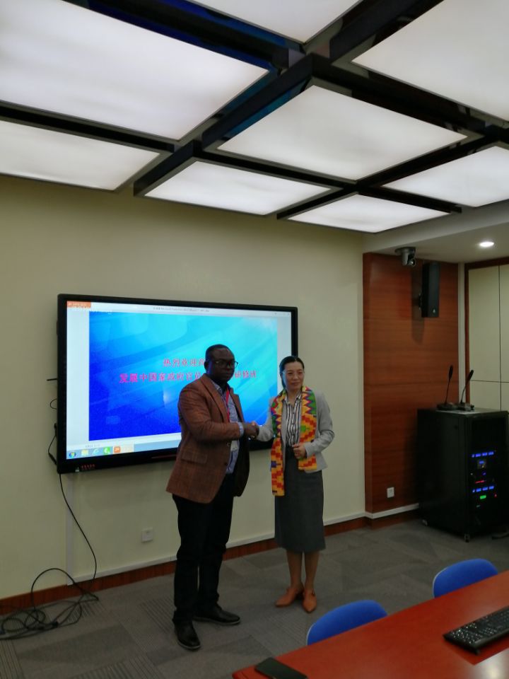 留学生办公室主任朱卫强、副主任李晶就学院专业设置、学校留学生招生情况、奖学金设置等情况作了介绍并回答了来宾的提问。司机社