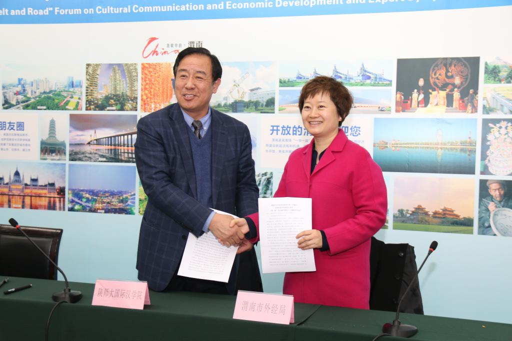 与国声智库、渭南市对外经济技术合作局签署了“一带一路”友好城市智库及“一带一路”友好城市国际人才战略合作协议,双方将在“一带一路”倡议研究资源共享,开展“一带一路”相关学术研究,国际学生文化实践基地、国际学生创业就业基地、国际学生实习基地及外籍人士华文教育基地建设等领域展开合作。