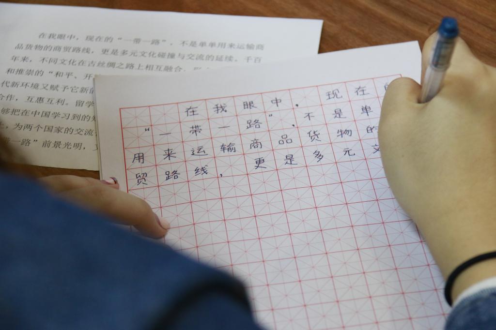唐风汉语教室率先拉开帷幕。来自14个国家的二十七名留学生参加了本次比赛,大家以“一带一路”连接下,我国与沿线国家区域间教育和人才培养合作的日趋深化为主题,抒写了对“一带一路”前景的美好祝愿。来自德国的留学生安德烈说,“写这些字虽然很累,有些字可能写错了,但他会继续努力写好汉字”。来自韩国的留学生李惠真说,“刚开始学写汉字很难,经常记不住,但是我天天练习,能记住越来越多的汉字,也越来越喜欢汉字”。此次活动反响热烈,不仅吸引了司机社