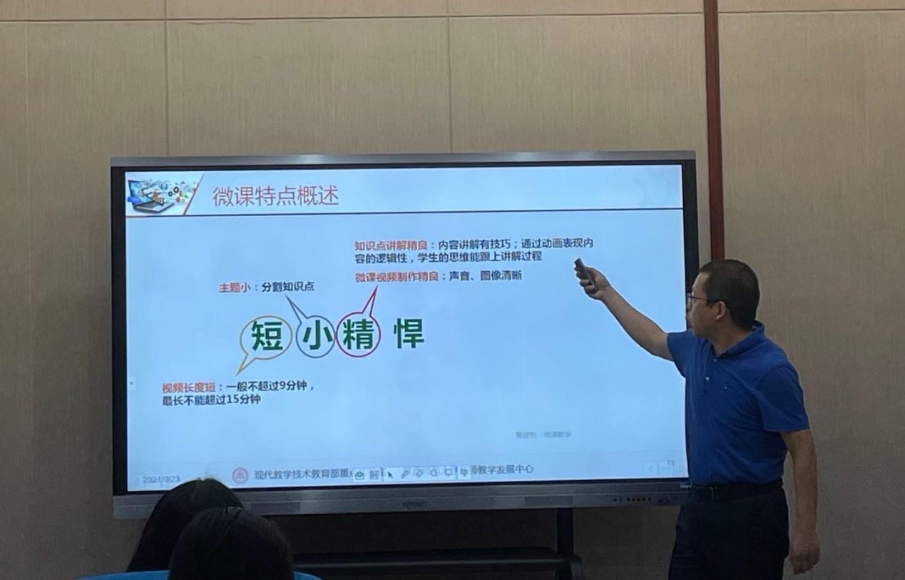 何聚厚教授的讲座主要包括三个方面:什么是微课、为什么需要微课以及微课设计的特点与要求。首先,他指出,典型的教学微视频形式由讲解和演示两部分组成,以知识点讲解为主,依托多媒体展示,通过动画以及有意义的图片,有逻辑性地展示教学内容,配合老师讲解,帮助学生理解学习内容。其次,何聚厚教授就“为什么需要微课”这一话题与同学们进行交流。他指出,微课的作用在于有效实现学生个性化自主学习,最核心之处在于将智慧技术运用于学生学习,解决学生差异性问题。