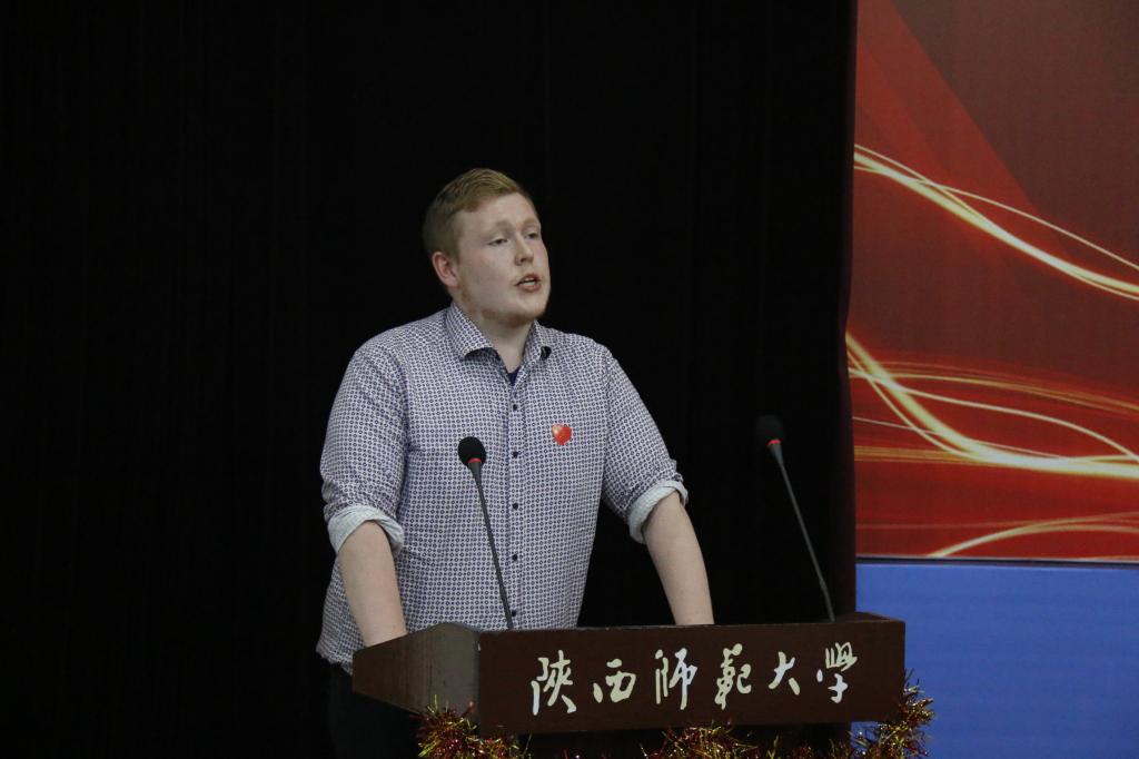 邵英、亚美尼亚籍留学生迪然、刘汉斌、英国籍留学生苏德锐分别代表学院教师、留学生老生、中国研究生新生和留学生新生做了发言。学院副院长吴媛代表学院向全体新生代表赠送了学习用品及校徽,开学典礼在与会人员的大合影中圆满结束。