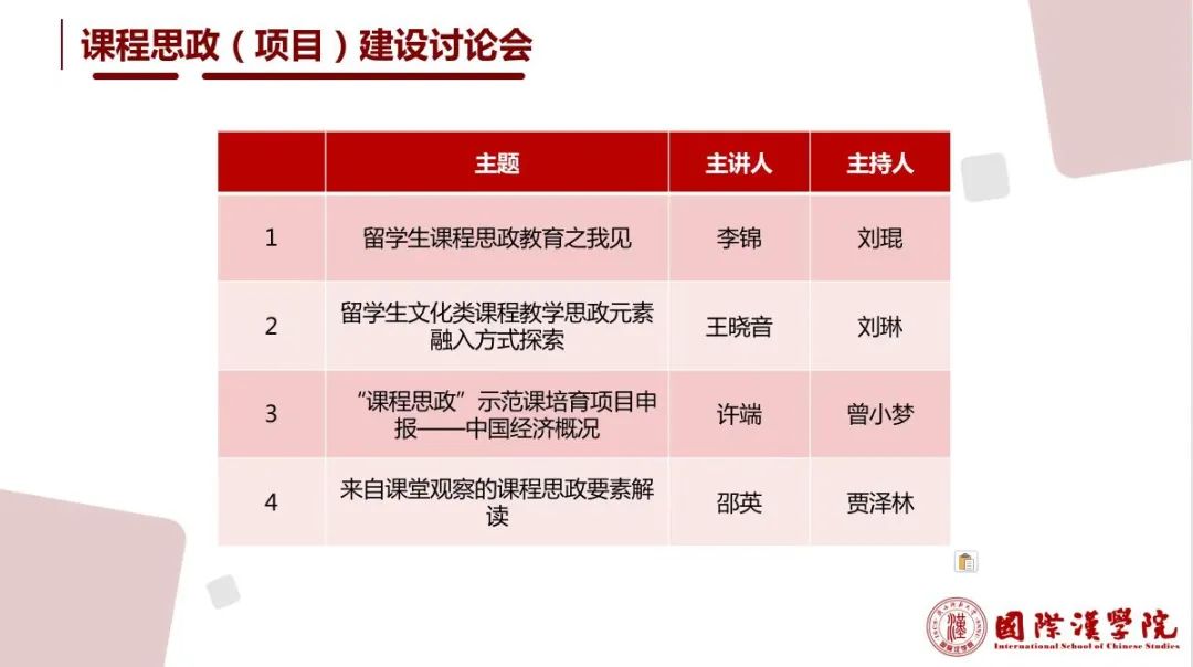 实际打造国际学生中国国情教育系列活动。学院党总支副书记张昊结合对学生活动的思考,指出在第一课堂之外,学院要积极开展各项社会实践活动、举办各类文化活动,帮助留学生在体验中感知中国变化、体悟中国文化。与会老师发言踊跃,分别从具体课程思政元素的融入、项目申报和结题等角度提出了各自的看法,针对相关问题开展了富有实效的讨论。