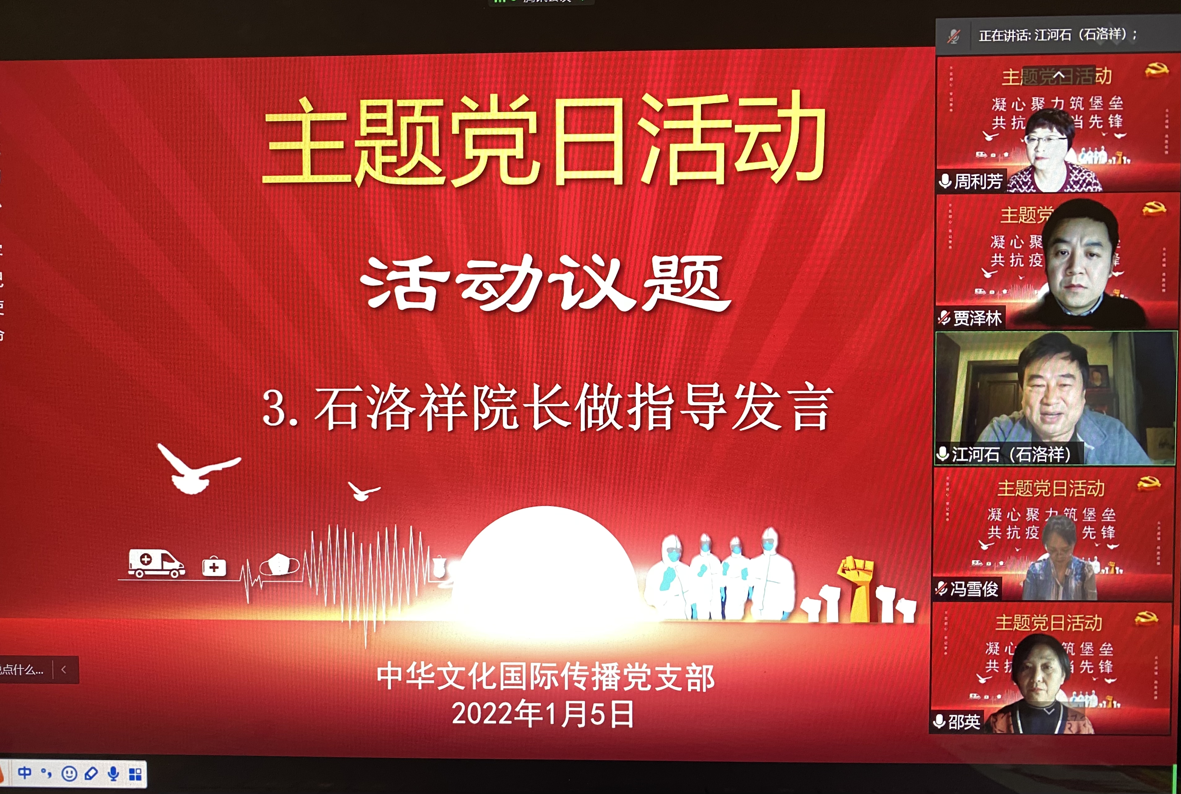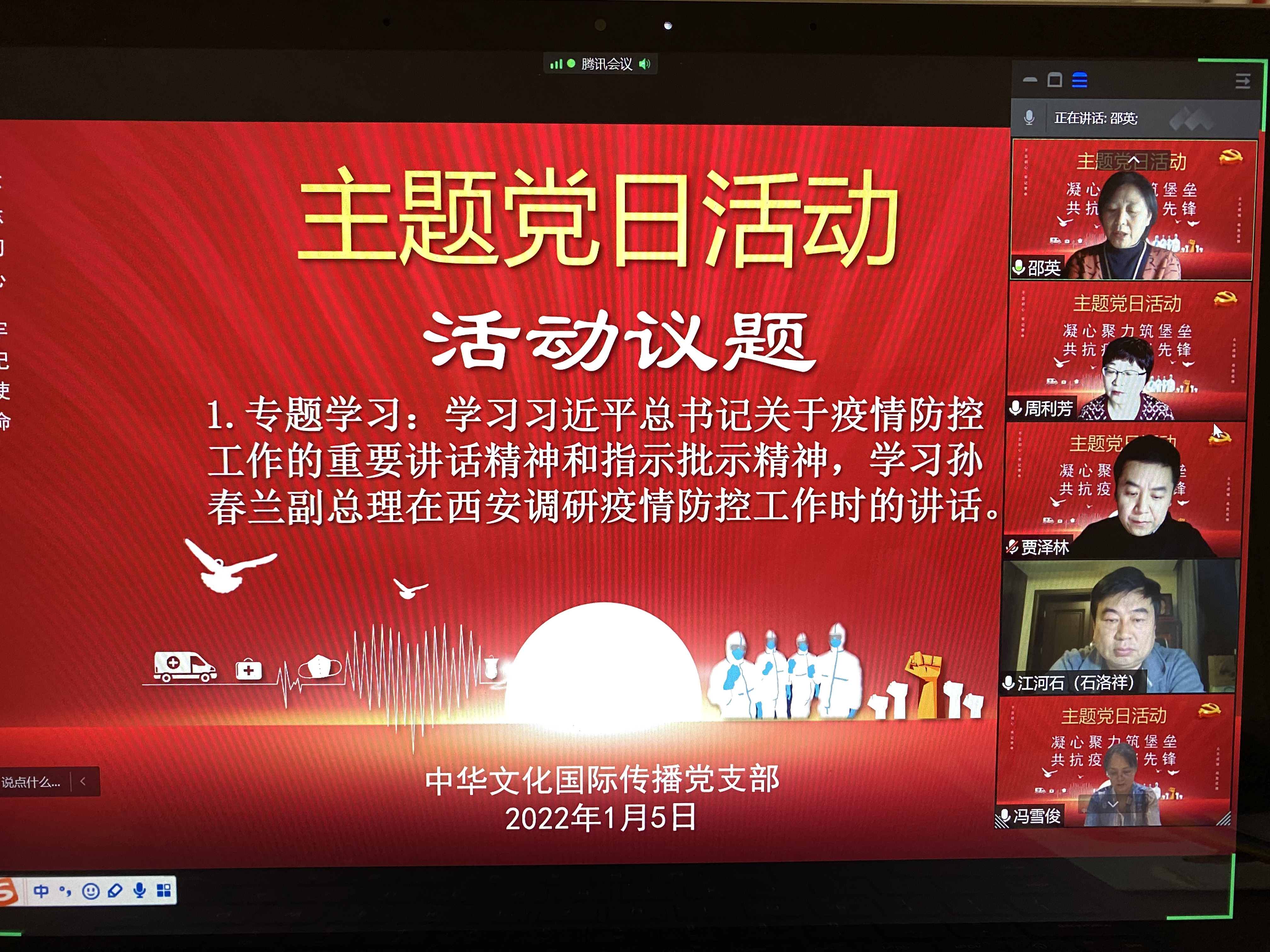 为了全面发挥教师党支部的战斗堡垒作用和教师党员的先锋模范作用,为坚决打赢疫情防控阻击战提供坚强的组织保证,2022年1月5日晚上,中华文化国际传播党支部全体党员汇聚云端,开展了“凝心聚力铸堡垒,共抗疫情当先锋”主题党日活动。活动由支部书记邵英主持,司机社