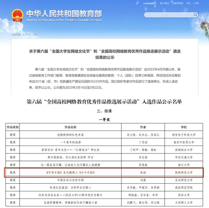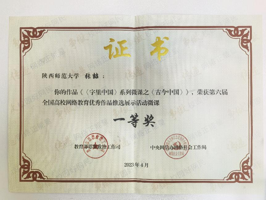 张喆副教授主讲的“《字里中国》系列微课之《古今中国》”荣获一等奖