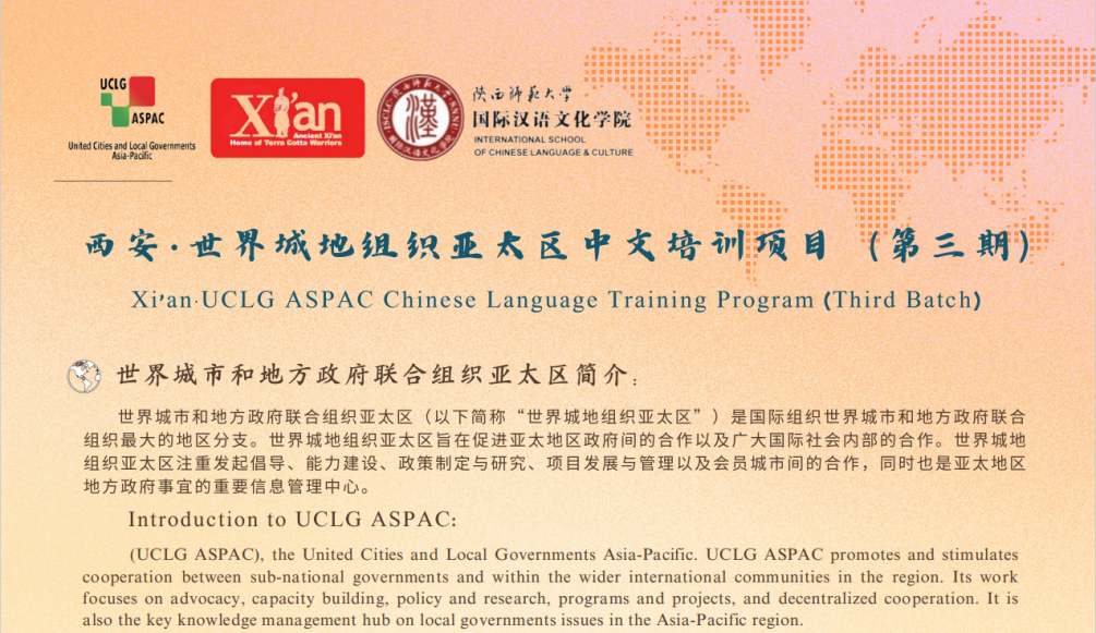世界城市和地⽅政府联合组织亚太区是国际组织世界城市和地⽅政府联合组织最⼤的地区分⽀。为满足亚太区中⽂学习者的语言学习需求,增强学习者对中华传统历史⽂化的了解,提升学习者对现当代中国发展的认知,根据西安市委外办的相关要求,依托陕西师范⼤学国际汉语⽂化学院的资源优势和师资力量,举办第三期世界城地组织亚太区中⽂培训项⽬。项⽬为学员提供专业、实⽤、丰富的数字化学习资源,课程内容在语⾔及⽂化学习基础上,重点突出公务交际场景应用及西安本⼟⽂化特色。